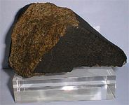 Dans cet exemple, la matrice est de couleur jaunâtre, tandis que la croûte de fusion est d'aspect noirâtre. Météorite "HAMADA DU DRAA" |